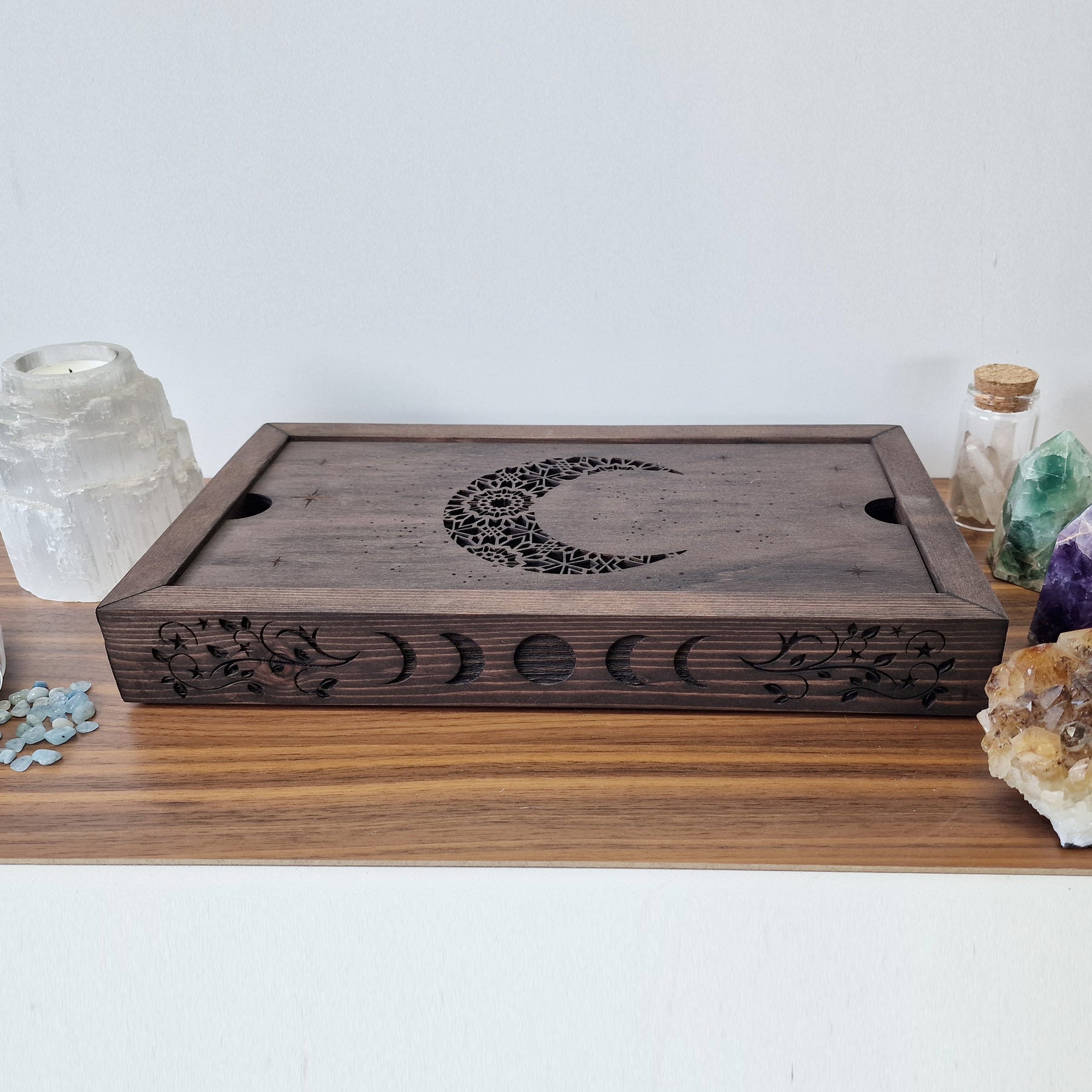 Our Major Arcana Tarot Crystal Storage Box provides the perfect foundation for your cleansing ritual. Handcrafted from solid pine in either natural or dark oak finish, its sacred symbolism creates an energetically protected space for your ceremony.