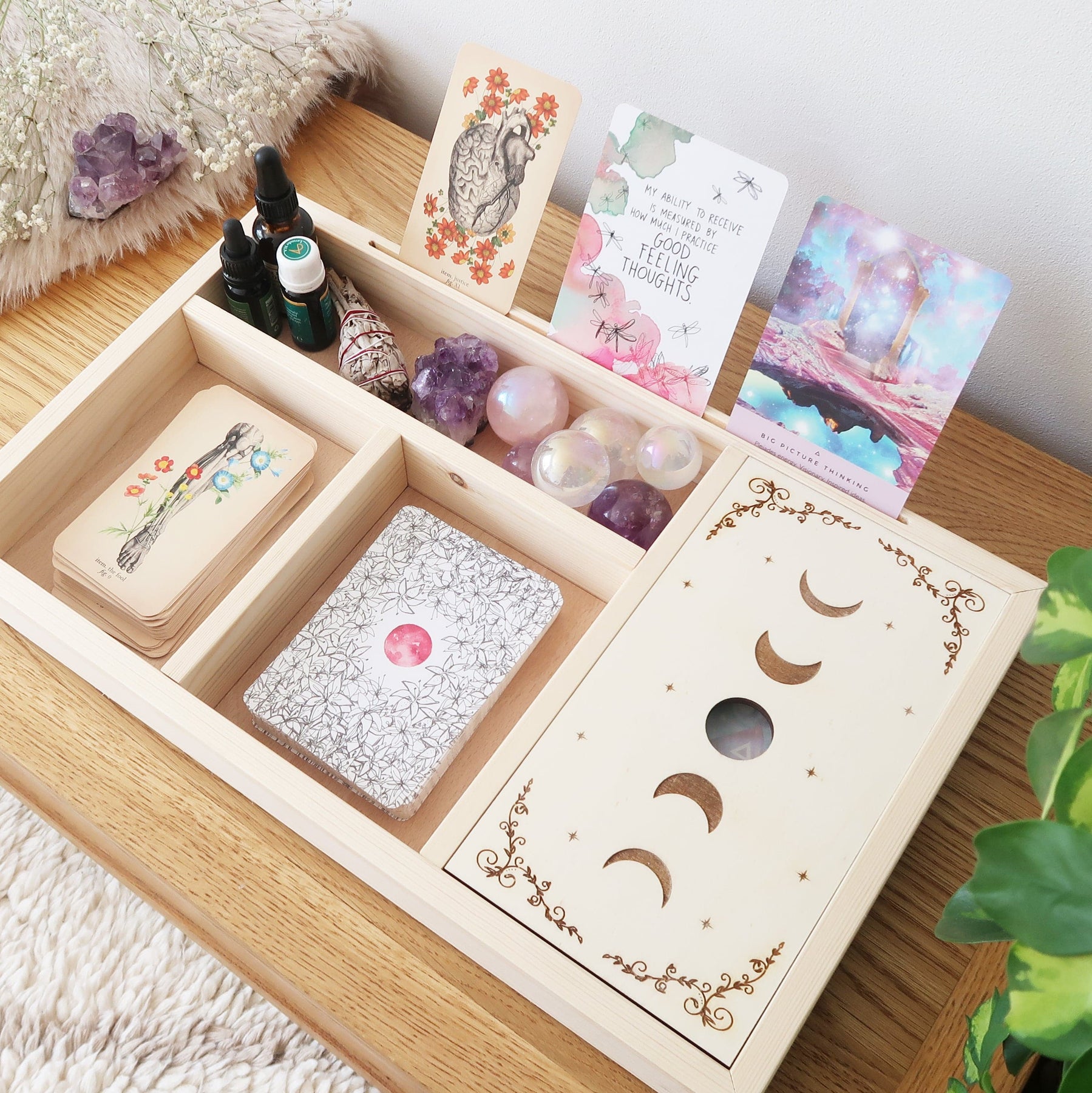 The box's compartments allow you to organize your sage, crystals, and deck in one sacred space, with long compartments perfect for storing smudge sticks and cleansing tools.