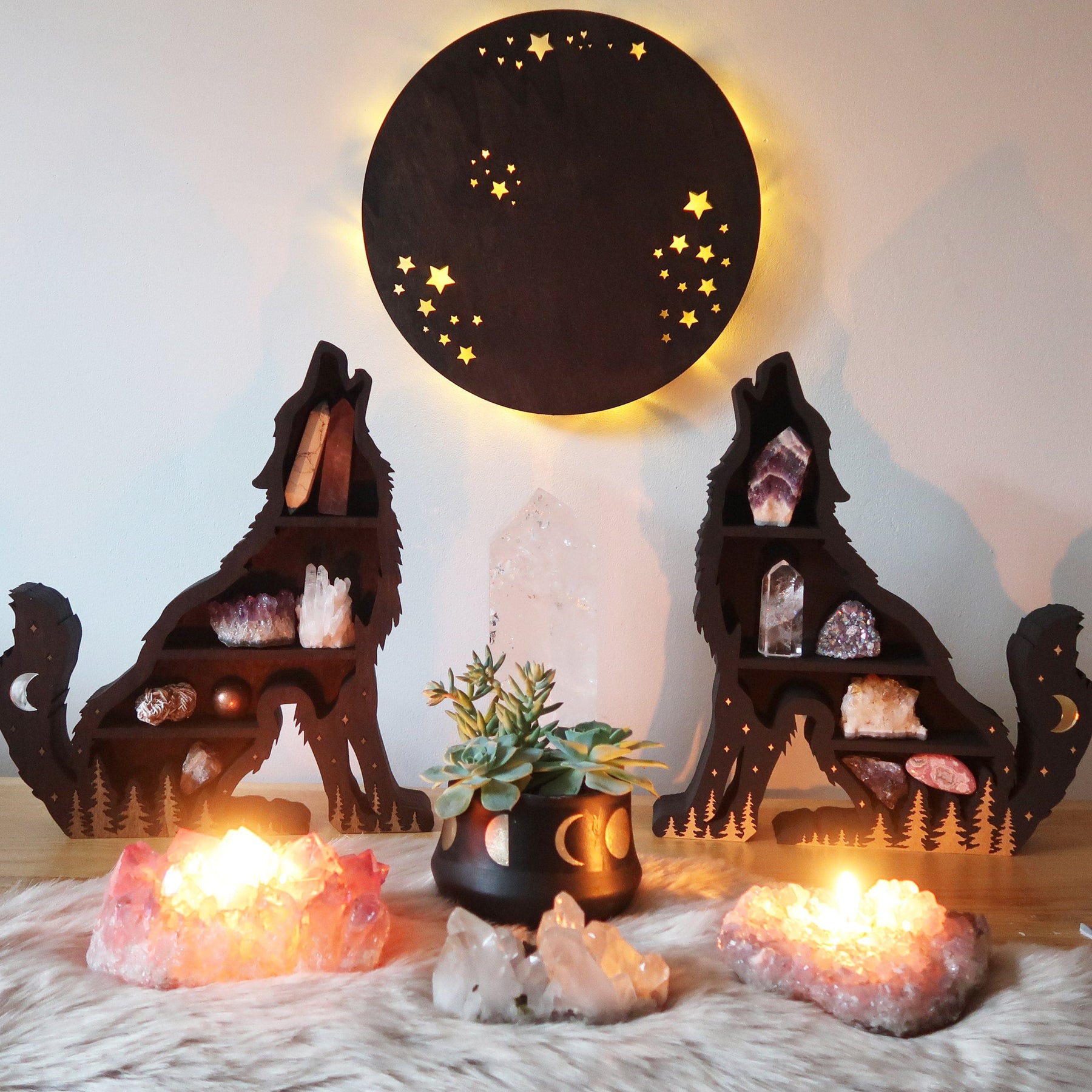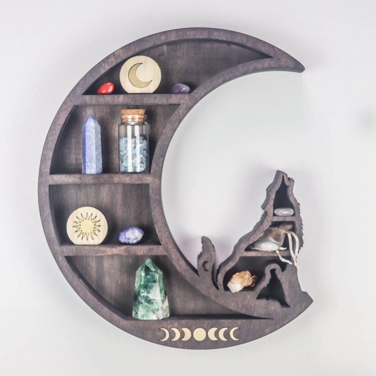 This wall-mounted shelf features a wolf and moon design that symbolizes intuition and wisdom—qualities that enhance the communication benefits of blue lace agate.