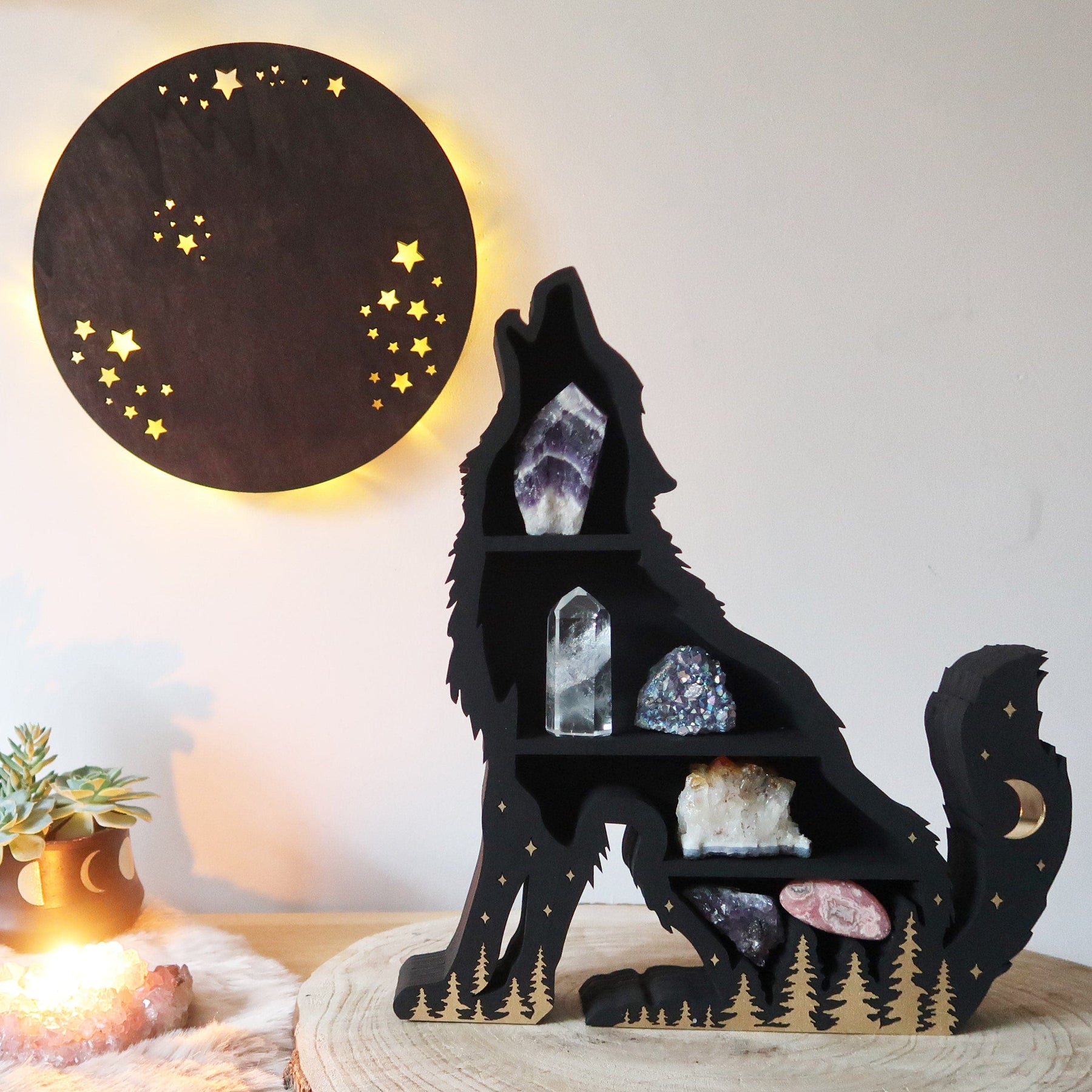 This handcrafted shelf features embedded trees and stars along with a mirror moon in the tail. The wolf symbolism creates a beautiful synergy with the protective properties of black tourmaline.