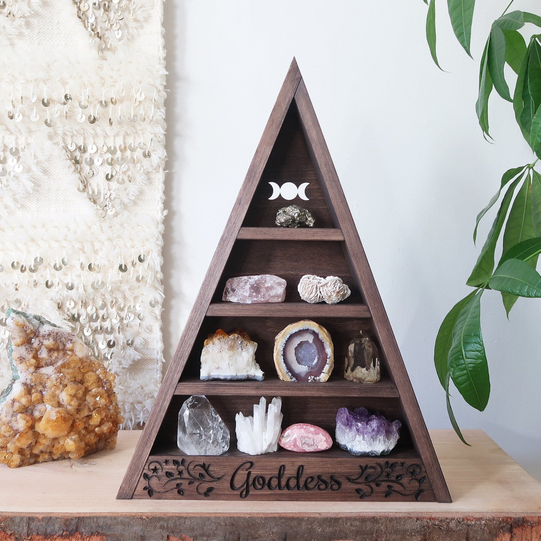 The Goddess Engraved Triangle Shelf provides the perfect foundation for your moonstone activation altar.