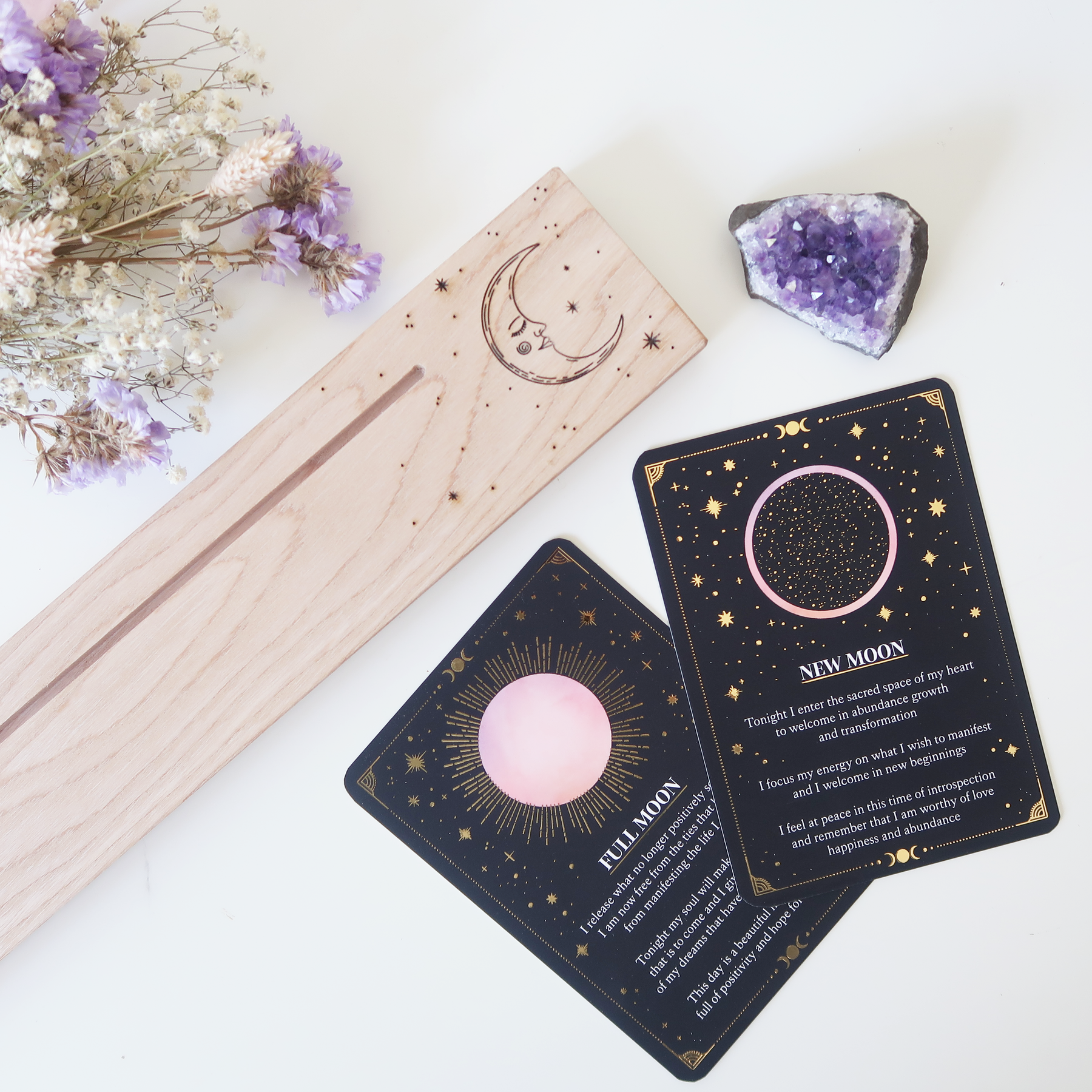 My current reading material rests on my Oak Sun and Moon Altar Card Stand, the hardwood base with its engraved celestial symbols holding both daily affirmation and tarot cards: