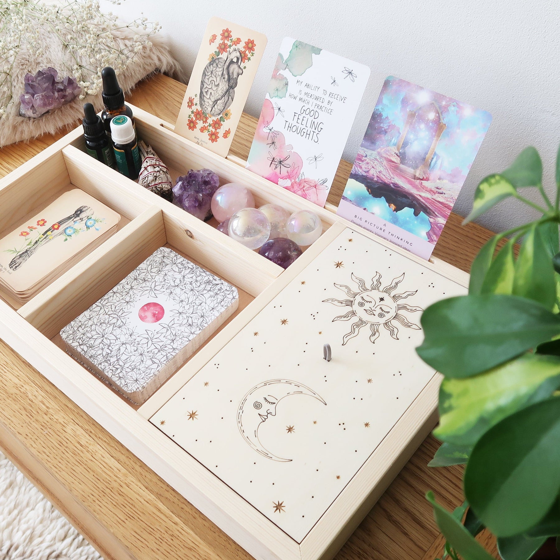 This handcrafted pine box with three compartments allows me to keep my relationship-focused tarot deck, future-oriented oracle cards, and past-life connection cards separated but accessible.