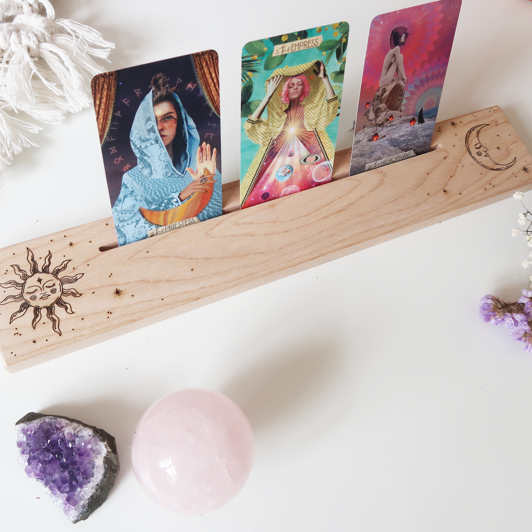 This beautiful hardwood stand with its engraved sun and moon design serves as a place for my cards to absorb intention and prepare for the reading ahead.
