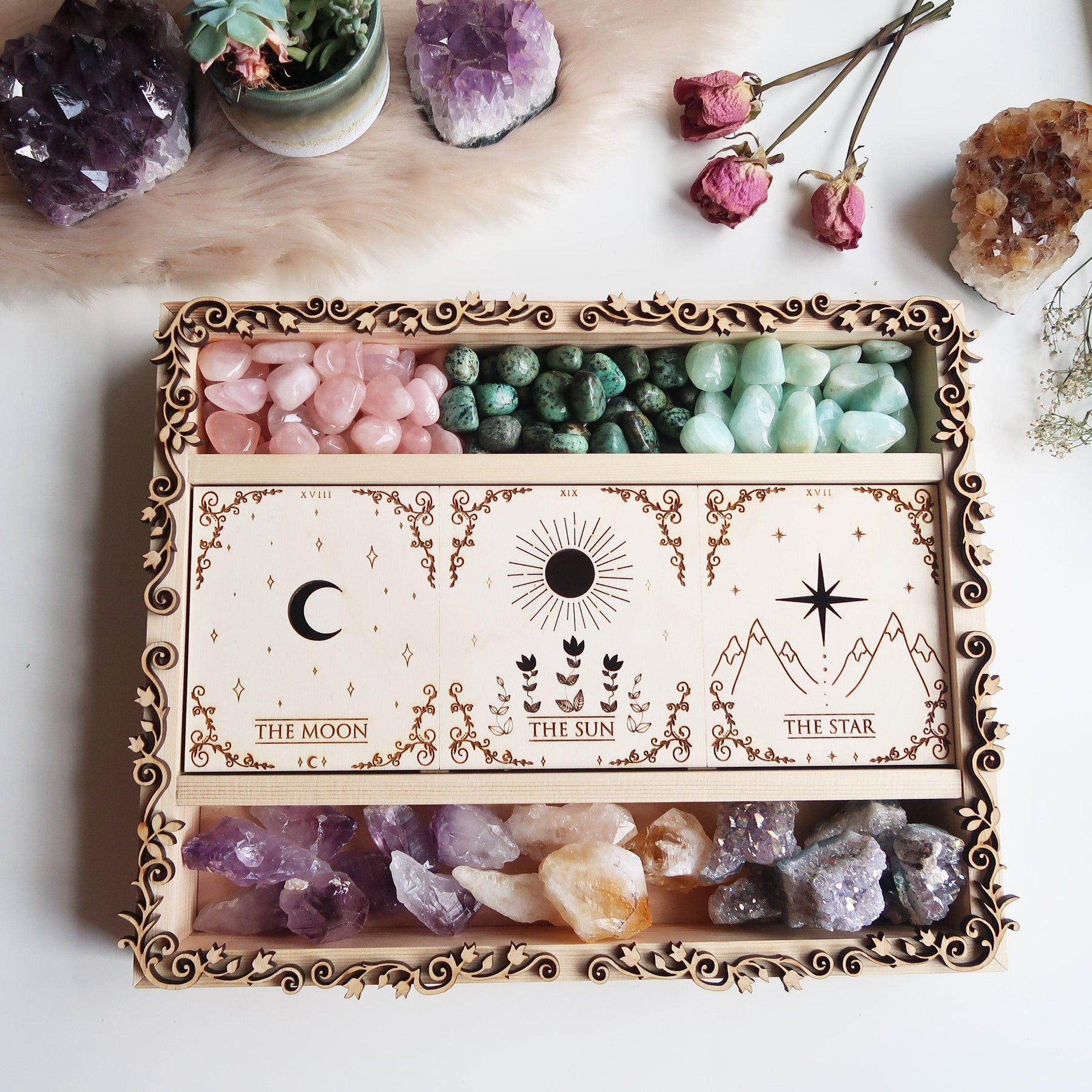 The solid pine construction with separate compartments allows me to organize cards by purpose while the display spaces let me include crystals that maintain the deck's energy between readings.