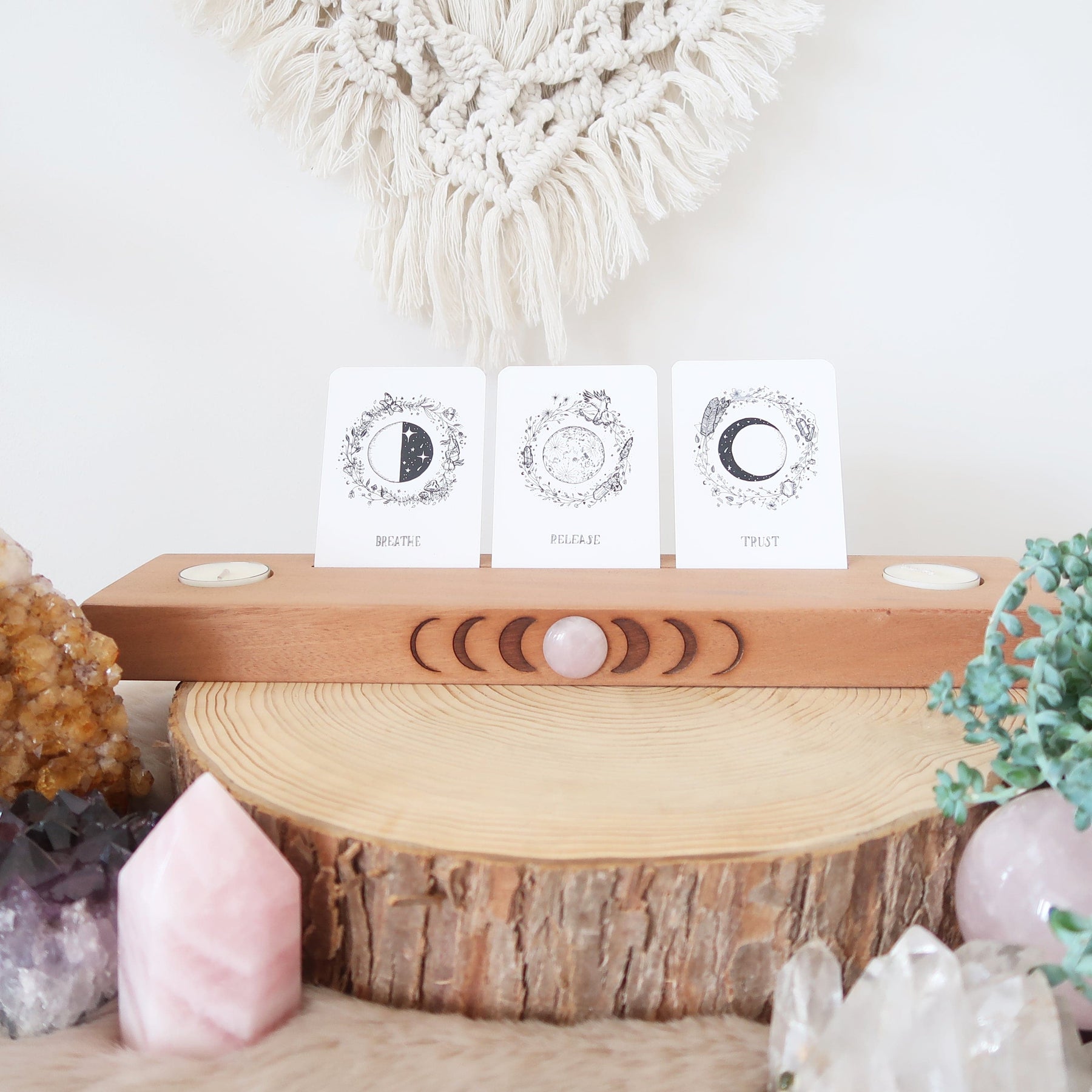 The Rose Quartz Engraved Moonphase Altar Card Stand with Soy Candles offers a perfect way to create a balanced solstice altar.