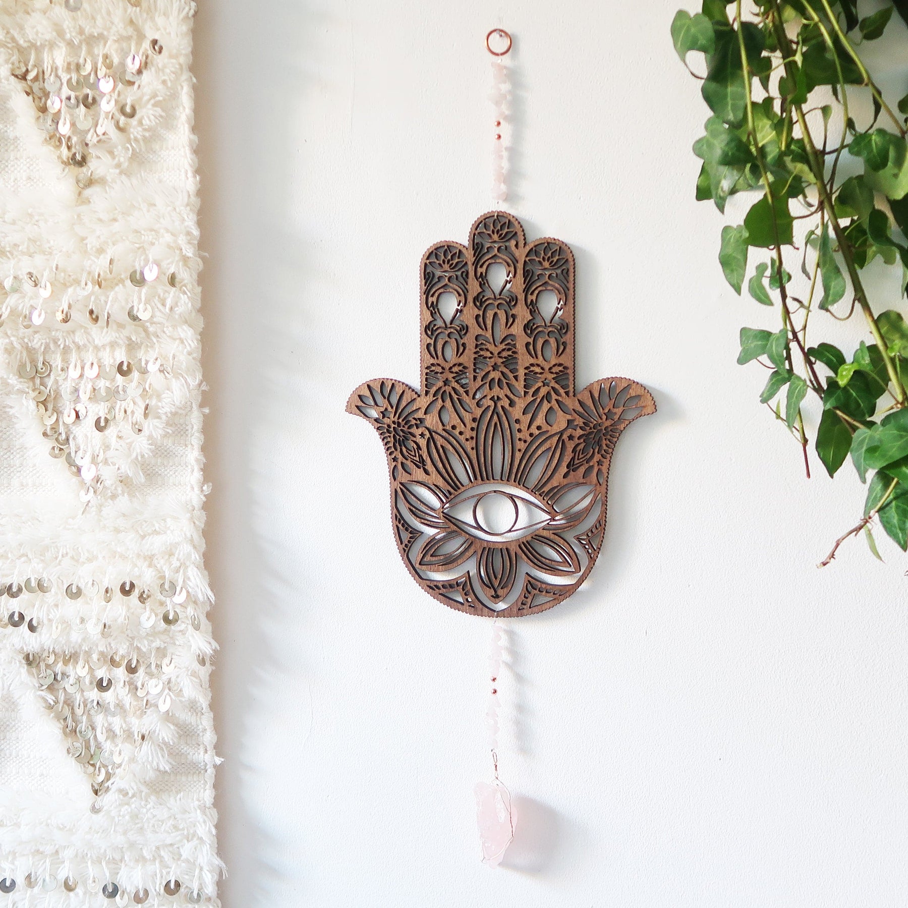 The Hamsa Hand Crystal Wall Hanging with Rose Quartz combines ancient protective symbolism with heart-opening crystal energy.