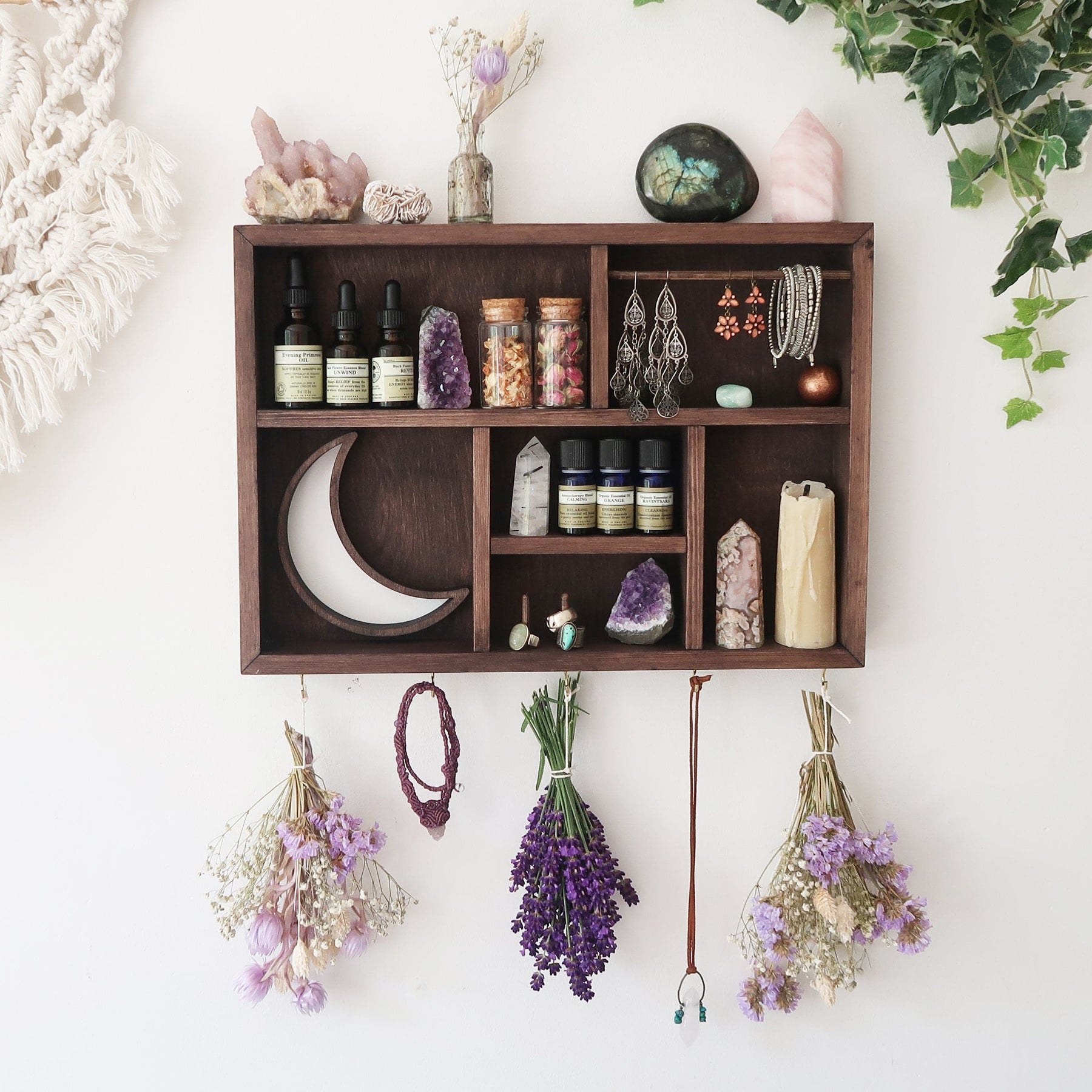 Available in four finishes (Dark Brown, Black, Warm Oak, or Natural Pine), this 43cm shelf features a crescent moon cutout that allows light to interact with crystals placed on the shelf.