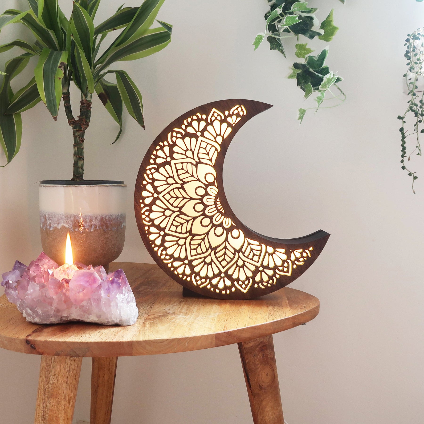 From full moon crystal shelf lamps that provide both illumination and display space for your treasures, to crescent moon wooden wall lamps that add a touch of celestial elegance to any room.